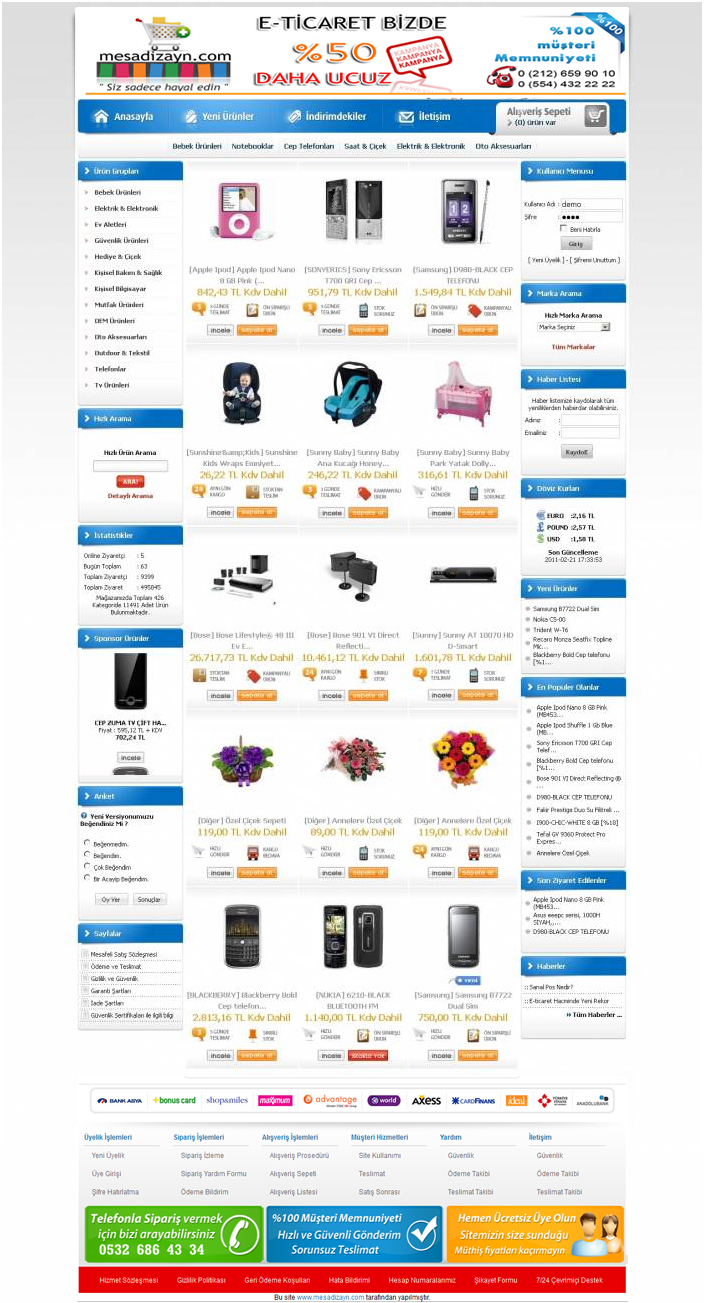 Mesa Eticaret Paketleriyle siteniz içerisinde dilediğiniz alanlarda Flash animasyon, görsel tasarımlar, video kullanabilir ve sitenizi zenginleştirebilirsiniz. Sitenizin sağ ve sol kısımlarına, logo eklenebilen kısma ve her kategoriye ayrı ayrı flaş ekleyebilirsiniz. Sağ ve sol blokları panelinizden, yerleşimini dilediğiniz gibi değiştirebilir, yenilerini ekleyebilirsiniz. Vitrin düzenlemeleri ile tüm ürün listeleme biçimlerinin diziliş adedini, sırasını hızlıca düzenleyebilirsiniz. Her kategorinizin vitrinini dilediğiniz gibi düzenleyebilir, dilediğiniz ürünlere öncelik tanıyabilirsiniz. Ürünlere özel butonlar tanımlayabilirsiniz. (Ücretsiz Kargo, Kargo Bedava, Kampanyalı Ürün, Stoktan teslim vb.)